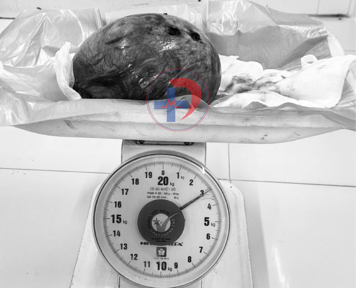 Kết quả siêu âm cho thấy tử cung to khoảng 24cm – tương đương kích thước thai 4–5 tháng, nhiều nhân xơ bên trong. Khối lớn nhất 170x100mm chèn ép bàng quang, gây tiểu nhiều lần.