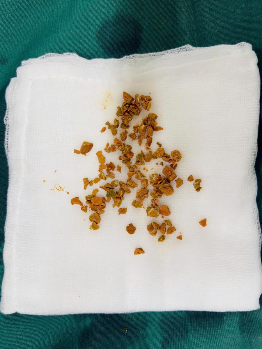 Người bệnh được chỉ định phẫu thuật nội soi tán sỏi. Trong quá trình phẫu thuật, ekip ghi nhận một viên sỏi kích thước lớn # 22mm. Bác sĩ tiến hành tán sỏi thành nhiều mảnh nhỏ, sau đó bơm rửa và lấy sạch toàn bộ sỏi ra ngoài.